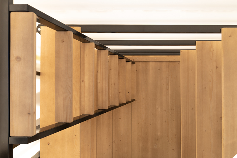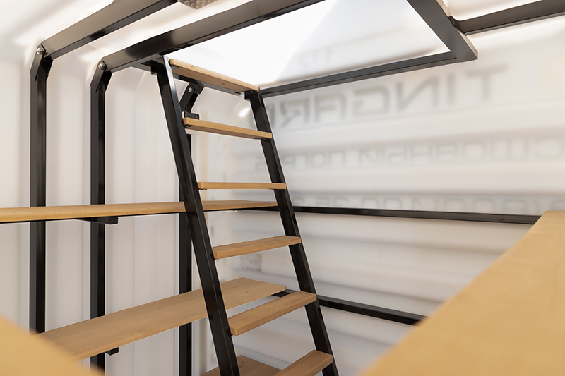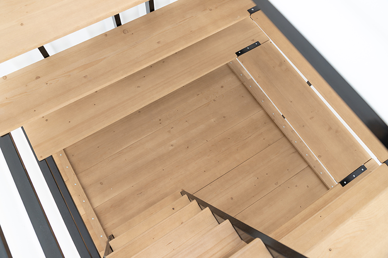 Вход в погреб организован через вертикальную горловину с утеплённой крышкой, снабжённой надёжным металлическим поручнем. Размер люка — 670 × 960 мм, что делает процесс спуска удобным даже при переносе габаритных предметов. Первая ступенька встроена в горловину и имеет антискользящее покрытие. Внутри установлена металлическая лестница с деревянными ступенями — прочная, устойчивая, комфортная в использовании.