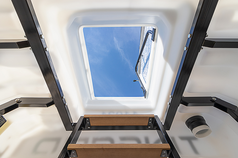 Модель оснащена утеплённой крышкой с прочным металлическим поручнем. Вход расположен вертикально и имеет размеры 670 × 860 мм — этого достаточно для комфортного доступа. Первая ступенька встроена прямо в горловину и покрыта антискользящим материалом для большей безопасности. Внутри установлена наклонная металлическая лестница с деревянными ступенями — надёжная и долговечная.