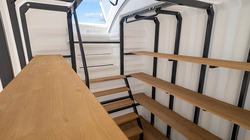 Крышка утеплена и снабжена встроенным поручнем для безопасного открывания и надёжной фиксации. Внутри установлена металлическая лестница с деревянными ступенями, а верхние ступени покрыты антискользящим материалом. Дополнительные перила и поручни делают использование погреба безопасным и удобным даже для пожилых людей.