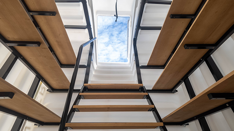 - Металлическая лестница с деревянными ступенями и антискользящим покрытием